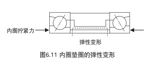 在主軸上固定角接觸球軸承時,用主軸軸肩和軸承螺母或用梯形套筒或兩者兼用方式擰緊固定軸承的內圈。 此內圈擰緊力會導致墊圈產生軸向彈性變形,使軸承的軸向游隙發生變化。特別是背對背組配的主軸軸承(DB,DTBT),由于內圈擰緊力會導致游隙變小,所以,可以推測組裝后的預緊量和運轉時預緊量會有所增加。對于內圈擰緊力導致的軸向變形,以往會考慮是內圈和內圈墊圈兩者的變形,但經過長期的實踐經驗,只需考慮內圈墊圈的變形即可。