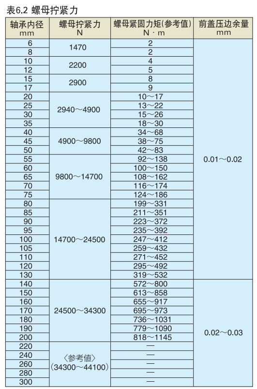 內圈墊圈的擰緊力因各廠商而異,NTN軸承的如下表所示: