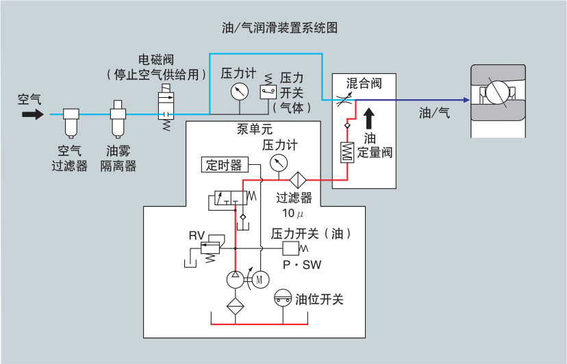 油氣潤(rùn)滑采用壓縮空氣,將控制在適當(dāng)量的潤(rùn)滑油供給軸承的方式,通常使用具備正確計(jì)量必要最少油量的定量活塞式分配器,通過(guò)計(jì)時(shí)器,以合適的時(shí)間間隔,正確地提供油氣潤(rùn)滑。