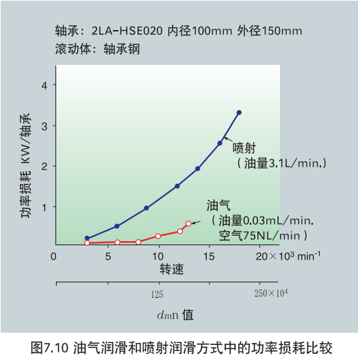 作為機(jī)床主軸的潤(rùn)滑裝置,雖然能夠?qū)⑤S承的溫升抑制在一個(gè)較低的范圍內(nèi),但由于需向軸承供給大量的潤(rùn)滑油,造成的力矩?fù)p失也非常大,從而需要使用大功率的電機(jī)。使用油料粘度在2~3 tmn2/s 的低粘度油。