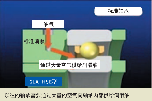通過采用環保型噴嘴可減輕標準噴嘴髙速噴出的空 氣與滾動體沖擊發出的噪音,因而還可減輕在高速運轉過程中產生的髙頻成分的嘶啦聲音。