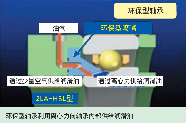 所謂環保型軸承,顧名思義,即是更環保,一般來說,環保型油氣潤滑角接觸球軸承及圓柱滾子軸承,通過與環保型噴嘴的組配,可減少油霧的飛濺(油煙)并降低噪音,以達到優化使用環境的效果。