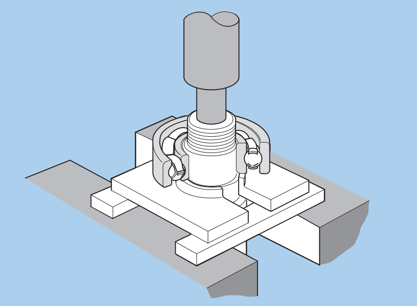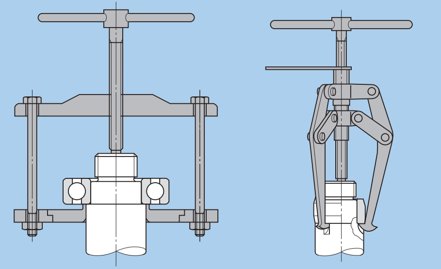 對于小型軸承,可采用如上圖所示的拉拔夾具將軸承拉出,但如果能夠采用如下圖所示的專業拆卸夾具,以壓出的方法壓出軸承,則更佳,下圖的工具,不僅不會損壞軸承,而且工作效率也更高。