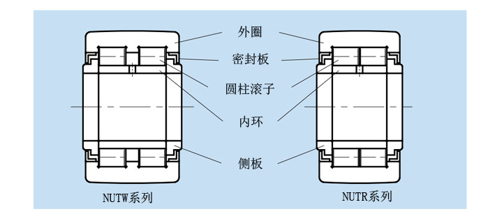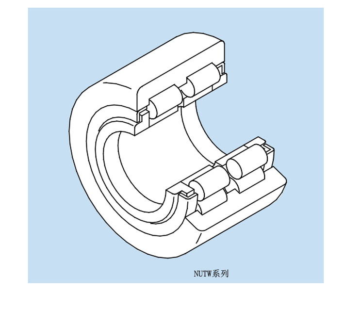 有帶中心肋的外圈的滾子從動(dòng)件(如下圖1NUTW系列)包括圓柱滾子、外圈、內(nèi)圈、側(cè)板和屏蔽板。外圈在滾道(跑道)上進(jìn)行滾動(dòng)運(yùn)動(dòng)。外圈設(shè)計(jì)為厚的,以承受沖擊載荷,因?yàn)樗c軌道直接接觸。