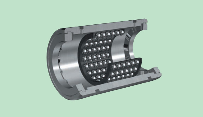 產品組件包括一個機加工外圈、側板、鋼球和一個固定鋼球的合成樹脂保持架。這種高精度軸承在軸上旋轉并產生有限的線性運動。外圈兩側設有卡環,卡環與保持架之間設有波紋彈簧墊圈,以緩沖作用在保持架上的沖擊,防止保持架磨損。