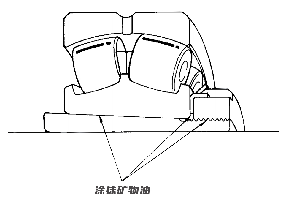 (1) 安裝工作前,用干凈的工廠布清除軸和套筒孔面上的機(jī)油。壓裝前,在螺母的錐度、螺紋和倒角面(見上圖)上薄薄地涂抹高粘度礦物油,尤其是在大型軸承的這些區(qū)域,需涂抹二硫化鉬膏,這樣可以防止擦傷,并便于拆卸軸承。
