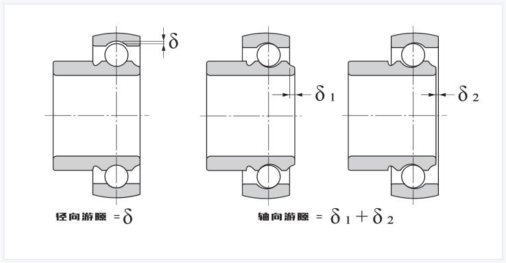 軸承內部游隙(初始間隙)是指軸承安裝在軸或殼體上之前的內部間隙量。如下圖所示,當內圈或外圈中的一個固定,另一個可以自由移動時,位移可以在軸向或徑向發生,該位移量(徑向或軸向)稱為內部間隙,根據方向,稱為徑向游隙或軸向游隙。