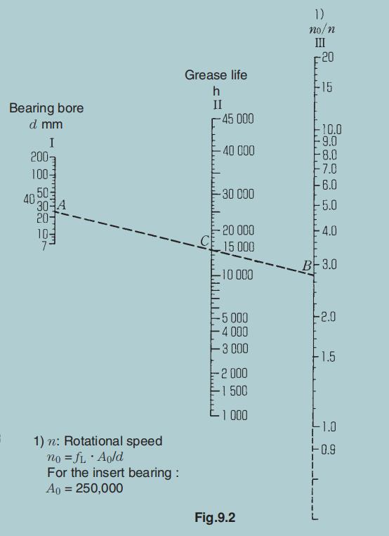 潤滑脂的壽命受軸承類型、尺寸、操作條件、溫度、有無灰塵、水和氣體進(jìn)入的條件影響,并且根據(jù)原材料的礦物油和肥皂基也有很大不同,上圖是計算NTN軸承單元的潤滑脂壽命的示意圖,該圖是基于過去的結(jié)果和NTN的實(shí)驗(yàn)結(jié)果編制的,適用于軸承工作條件正常的情況,如果已知軸承的類型、孔徑以及允許轉(zhuǎn)速與實(shí)際轉(zhuǎn)速的比率,則可以計算出潤滑脂壽命,以這種方式計算的潤滑脂壽命不是一個絕對值,但應(yīng)被視為具有很大安全性的特定指南。