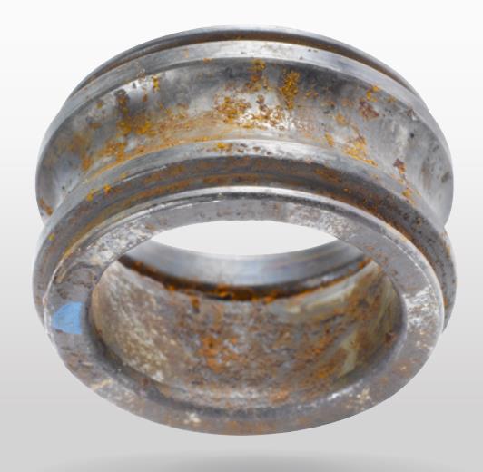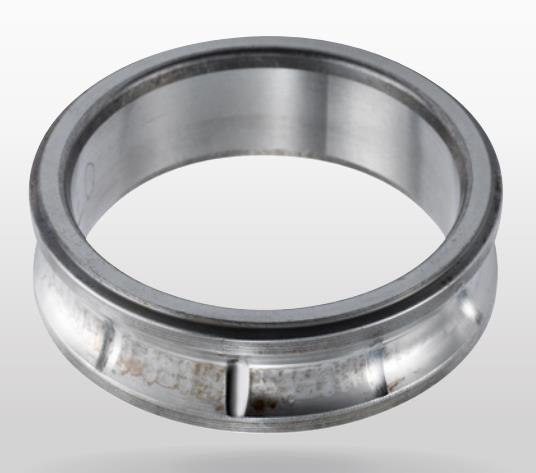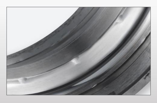 二、微動腐蝕。當軸承套圈與滾動體之間產生微觀位移時,會導致軸承產生微動腐蝕,軸承外表面出現氧化層,如上圖所示,為有效避免這種情況的發生,在安裝軸承前,需檢查軸承精度,軸承套圈與軸一般應過盈配合,如精度不夠,不能夠過盈,即會發生微動,過盈配合,安裝會比較困難,應使用抗微動膏和感應加熱器將軸承安裝在軸上。