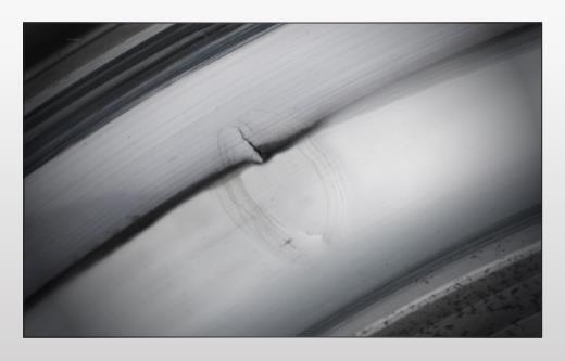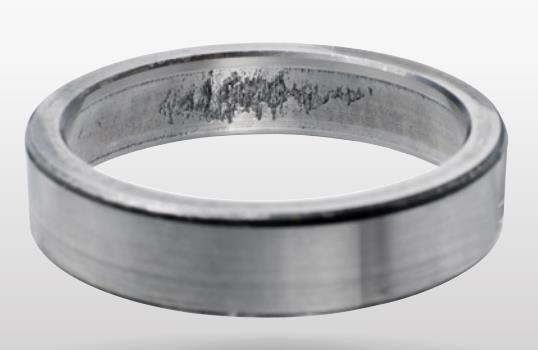 六、內里深度剝落。當軸承受到循環應力時,軸承會產生內里深溝剝落,這種剝落通常為橢圓形的剝落,如上圖所示,為防止這種損壞,應確保軸承兼容,在設備上使用監測系統,檢測與疲勞引起的剝落開始相關的振動和噪音,同時遵循軸承更換的預測性維護計劃。