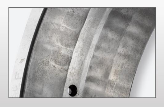 十、顆粒作用下的磨損。當軸承邊界潤滑中有固體顆粒磨損時,這種情況會發生,軋制外殼和滾道上會產生亞光表面、條紋或凹坑,如上圖所示,為避免之,軸承應使用清潔的潤滑劑,使軸承充分潤滑,同時選擇適當的密封裝置,如防塵蓋,或密封件等。