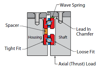 角接觸軸承作為單個軸承購買時,需要在安裝期間設置軸向預緊,如果軸承采用背靠背(DB)布置,則通過將兩個軸承的內(nèi)圈壓向彼此來設置預緊。如果推力載荷僅在一個方向上施加,則軸承也可以使用波形彈簧預緊。