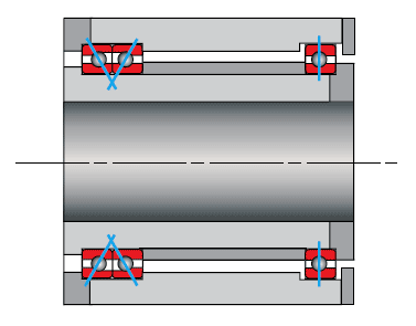 一對角接觸軸承在施加力矩載荷下的壽命和承載能力可以通過使軸承進一步間隔來增加,軸在施加力矩下的角偏轉(zhuǎn)(傾斜)也隨著間距的增加而減小,然而,如果軸和殼體采用不同的材料或在不同的溫度下工作,軸承可能會對熱膨脹差更敏感。