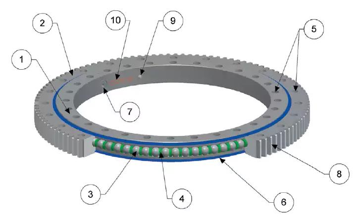 其中一個(gè)軸承套圈中需有一個(gè)或更多的潤(rùn)滑脂加油嘴,用于定期潤(rùn)滑滾道和內(nèi)部部件,在具有整體輪齒的設(shè)計(jì)中,潤(rùn)滑孔位于非齒輪套圈,加注孔的數(shù)量通常隨軸承直徑增加而增加。