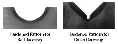 上圖反映了四點(diǎn)接觸球(RK、HS、HT、MT、KH和XT系列)和交叉滾子(XR系列)軸承的典型硬度模式,多列軸承(DT和TR系列)在其高應(yīng)力滾道中采取類似的處理方式。