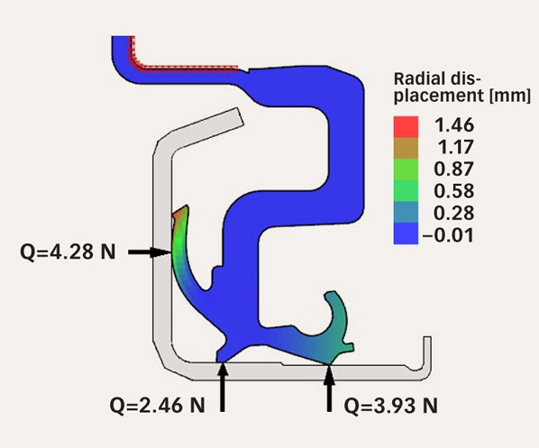 計算安裝在軸上的密封件的能力是一個附加功能,當(dāng)安裝密封件時,它會在反表面上施加一個力,稱為唇緣力,唇緣力是密封件在靜態(tài)和動態(tài)操作條件下最重要的參數(shù)之一,唇緣力可確保所需的密封性,但也會導(dǎo)致唇緣下的密封摩擦,此外,當(dāng)密封材料老化時,可以使用彈簧來保持足夠的密封唇力。因此,準確預(yù)測不同操作條件下的唇緣力是模擬工具的關(guān)鍵要求,這將有助于減少設(shè)計迭代次數(shù),從而縮短新產(chǎn)品的上市時間。