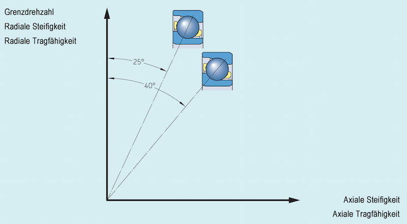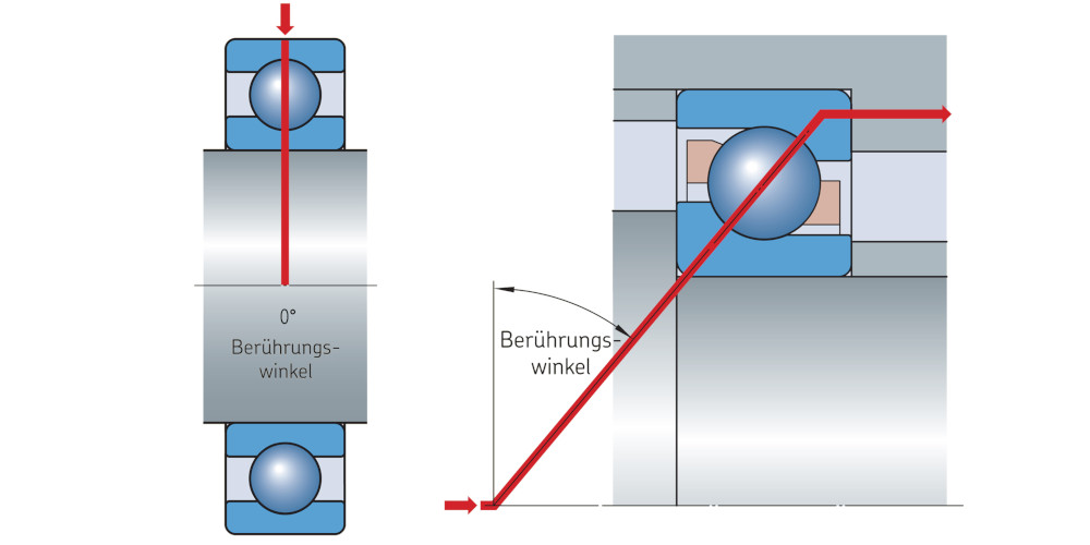 每個滾動軸承都有一個接觸角,力通過該接觸角在軸承內傳遞,最簡單的情況是深溝球軸承,在純徑向載荷下,其接觸角為0°,相比之下,角接觸球軸承的接觸角總是大于0°,如上圖所示。