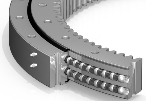 二、雙列滾珠回轉(zhuǎn)支承(02系列)軸承。雙列滾珠回轉(zhuǎn)軸承有三個(gè)座圈,鋼球和隔離塊可以直接排放到上下滾道中,根據(jù)受力情況,布置上下兩排不同直徑的鋼球,這種開(kāi)放式組裝非常方便,上下弧形滾道的承載角度為90度,能夠承受較大的軸向力和傾覆力矩,當(dāng)徑向力大于軸向力的0.1倍時(shí),必須對(duì)滾道進(jìn)行特殊設(shè)計(jì),不同直徑的雙列滾珠回轉(zhuǎn)支承軸承具有相對(duì)較大的軸向和徑向尺寸,結(jié)構(gòu)緊湊,特別適用于需要中等或更大直徑的塔式起重機(jī)和汽車(chē)起重機(jī)等裝卸機(jī)械。