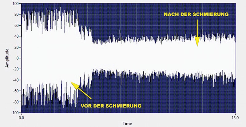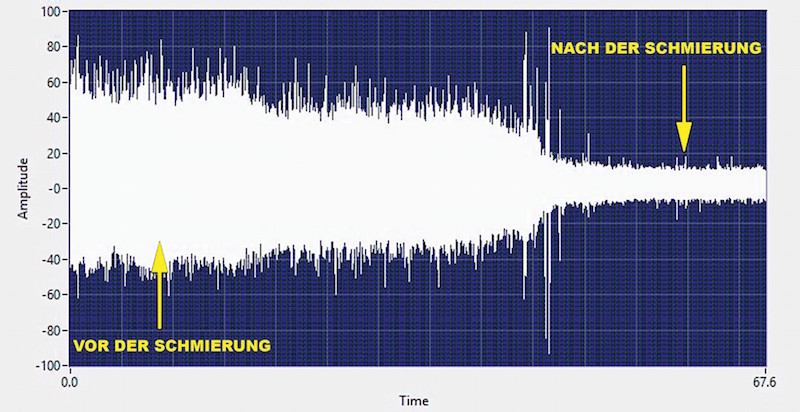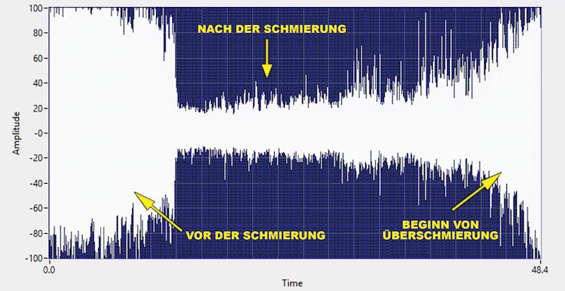 圖3,軸承開始過度潤滑。該記錄顯示了當(dāng)向軸承中添加更多潤滑脂且超過過度潤滑極限時(shí),dB值和振幅的增加變化。