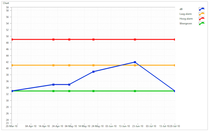 圖4,軸承潤滑歷史。該圖顯示了在驅(qū)動(dòng)軸承上測量的分貝測量趨勢,根據(jù)基線dB(綠色)、低報(bào)警電平(黃色)和極高報(bào)警電平(紅色)顯示測量值。