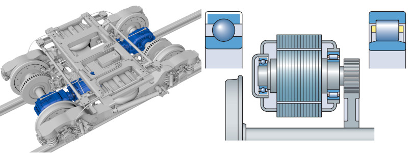 當(dāng)電流通過軸承時,可能會損壞軸承(電蝕),例如在軌道車輛的電動牽引電機(jī)中(如下圖所示),在今天,有許多文獻(xiàn)涉及這一主題,包括對損害原因和對策的研究。