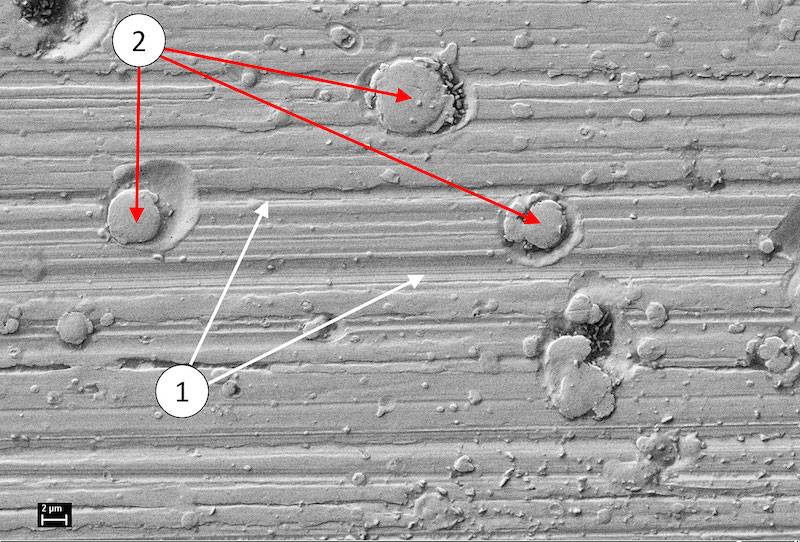 此時就會損壞軸承,滾道的接觸面局部熔化,該區(qū)域的鋼材質(zhì)發(fā)生變化,這會以滾道和潤滑劑損壞的形式對軸承性能產(chǎn)生負(fù)面影響,并導(dǎo)致磨損增加及軸承振動增加,如上圖(由于有害的電流通過,深溝球軸承的外圈滾道損壞成磨砂滾道)和下圖(有害電流通過導(dǎo)致的帶有微坑的軸承表面圖像,①為表面處理痕跡,②為微坑)所示,顯示了EDM電流的影響,由于高頻電流,軸承表面呈現(xiàn)出微小的凹坑,這種損壞在當(dāng)今使用變頻器應(yīng)用中非常常見。