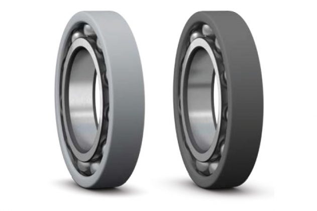 抵消電流對軸承破壞性影響的一種方法是使用帶有集成熱噴涂層的軸承,幾乎各個品牌都有這類軸承,SKF亦是如此,在SKF中,這類軸承被稱為INSOCOAT軸承,該類軸承將電絕緣集成到軸承中,其外圈或內(nèi)圈的外表面涂有電絕緣涂層,如下圖所示(左邊灰色的是SKF上一代INSOCOAT軸承,右邊深灰色的是優(yōu)化的新一代版本),涂層由氧化物陶瓷材料組成,并通過熱噴涂工藝涂覆到軸承上。