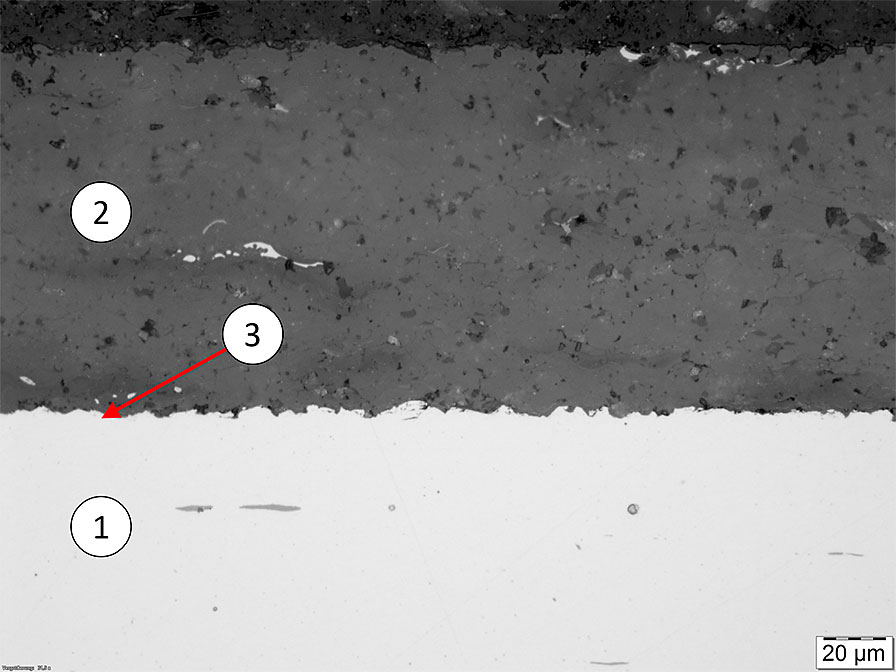 最常見的是涂層材質(zhì)是純氧化鋁(Al2O3),由于不同的涂層具有不同的電氣和機(jī)械性能,有時也使用氧化物混合物。在熱噴涂過程中,氧化物顆粒在熱等離子流中被輸送和熔化,這種熱流將大部分熔融顆粒輸送到預(yù)處理的基底,在那里它們冷卻并形成所需的涂層,如下圖所示為軸承外圈INSOCOAT涂層的橫截面,①為軸承鋼,②為熱噴涂層,③為涂層。
