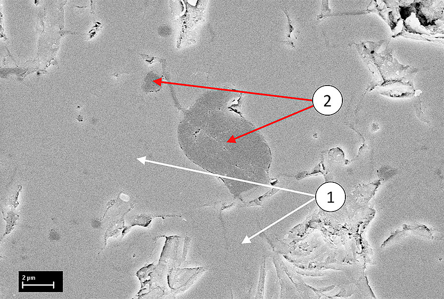 在噴涂過程之后,涂層具有一定數(shù)量的開口和互連的孔隙,這是熱噴涂涂層的一般特性,孔的數(shù)量和外觀強(qiáng)烈依賴于涂覆工藝的參數(shù),氣孔在熱噴涂過程中起著核心作用,降低了腐蝕風(fēng)險,改善了機(jī)械性能,并保持了絕緣性能恒定(在潮濕環(huán)境中非常重要),下圖顯示了一個封閉氣孔的示例(熱噴涂層結(jié)構(gòu)的SEM圖像,可見絕緣涂層的封閉孔),圖中①為氧化物材料,②為密封孔。