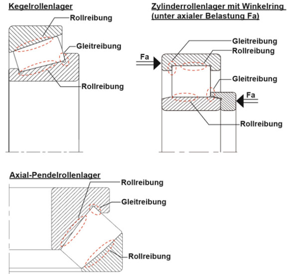 高工作溫度是強烈金屬接觸的直接結果,特別是滾動元件端面和軸盤導板之間的接觸(見最開始圖中的軸向調心滾子軸承),短時間后,對軸承的功能表面造成了不可逆轉的損壞。通過切換到使用適合于軸向調心滾子軸承要求的具有相應高粘度的油,可以實現接觸表面的安全分離和低工作溫度。