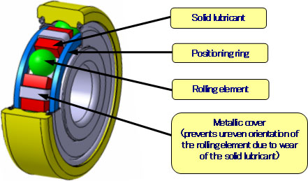 此外,該軸承還在防塵蓋和固體潤滑劑之間安裝了一個定位環,以幫助沿旋轉方向輸送潤滑劑,確保滾動元件(球)和潤滑劑之間的理想接觸,從而實現更平穩的旋轉。除了為軸承的滾道表面提供可靠的潤滑劑供應外,該設計還將旋轉扭矩降低到約1/4。在固體潤滑劑上覆蓋金屬蓋有助于防止內圈和外圈分離,即使固體潤滑劑磨損嚴重,也可以正常使用。