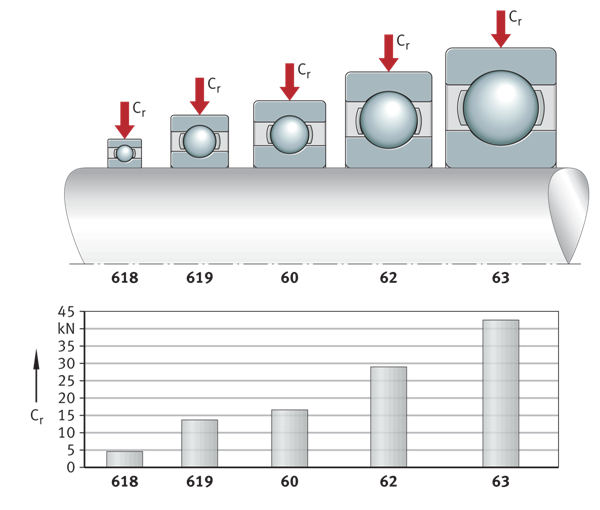 承載能力取決于軸承系列,618和619系列的深溝球軸承,其軸承橫截面較小,載荷小于60、62和63系列,這些軸承的尺寸與孔徑d相同,橫截面較大。