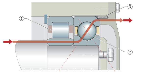 用作軸向軸承的四點接觸球軸承 ①圓柱滾子軸承(徑向軸承) ②外圈帶固定槽的四點接觸軸承(軸向軸承,外圈未徑向固定) ③外圈鎖銷 | ![]() |