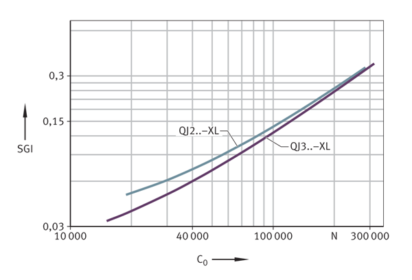 SGI值基于內部標準中軸承的最大允許噪聲水平,該標準是根據ISO 15242計算得出的。為了能夠比較不同的軸承類型和系列,將SGI值與基本額定靜載荷C0進行對比。