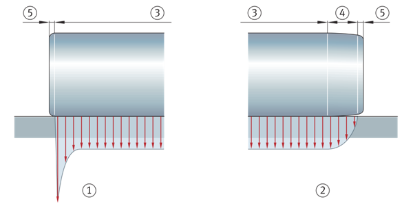 滾子和應力分布 ①圓柱滾子輪廓(峰值高應力) ②帶異形端部的滾子(峰值無應力) ③圓柱形中心區域 ④對數漸縮區 ⑤邊緣圓角 | ![]() |