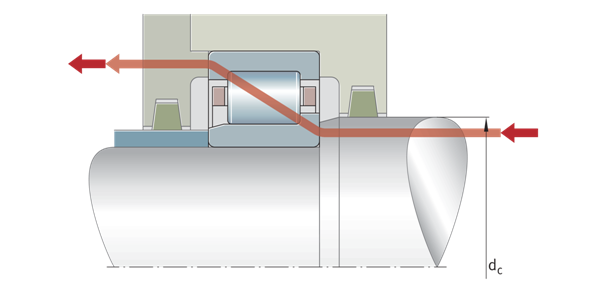 內圈肋支架-NJ型(半定位軸承) dc=軸肩的建議高度,帶軸向預緊肋 箭頭=力流 | ![]() |