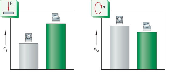 承載能力和速度比較——單列圓錐滾子軸承/單列角接觸球軸承 Fr=徑向載荷 Cr=基本動態(tài)額定載荷 nG=極限速度 | ![]() |