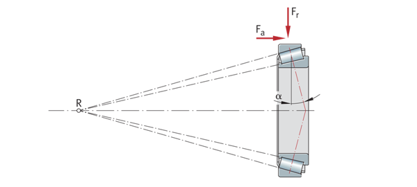 單列圓錐滾子軸承 錐形表面的頂點在軸承軸線上的一點處相交 Fr=徑向載荷 Fa=軸向載荷 R=圓錐滾子頂點 α=標稱接觸角 | ![]() |