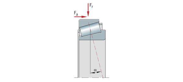 單列圓錐滾子軸承 Fr=徑向載荷 Fa=軸向載荷 α=標稱接觸角 | ![]() |