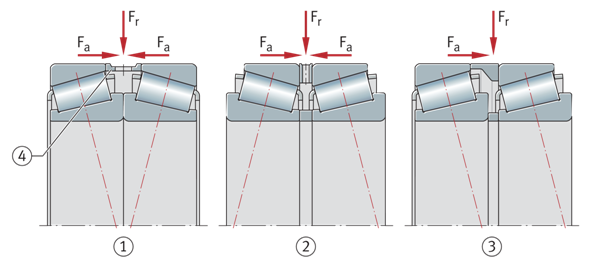 串聯(lián)、X型和O型排列、負載方向、接觸線 Fr=徑向載荷 Fa=軸向載荷 ①X型(面對面) ②O型(背靠背) ③串聯(lián)配對 ④隔圈 | ![]() |