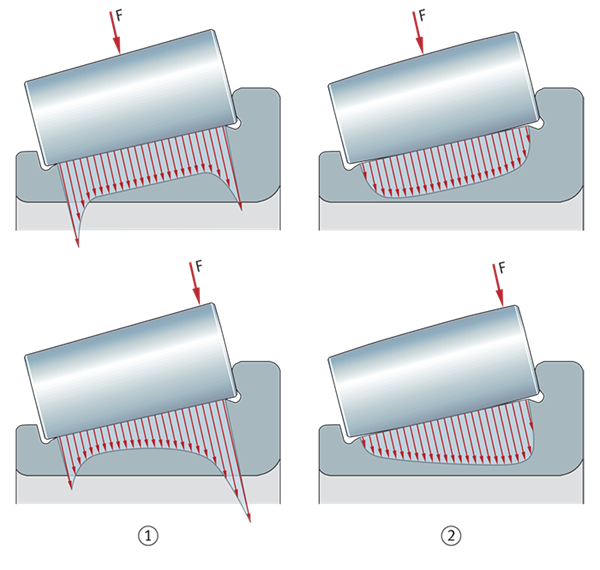 由于優(yōu)化了滾子和滾道輪廓,負載分布均勻 F=滾子上的負載 ①直型滾子 ②凸型滾子 | ![]() |