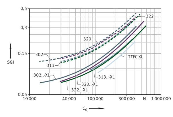 SGI值基于內(nèi)部標準中軸承的最大允許噪聲水平,該標準是根據(jù)ISO 15242計算得出的。為了能夠比較不同的軸承類型和系列,將SGI值與基本額定靜載荷C0進行對比。