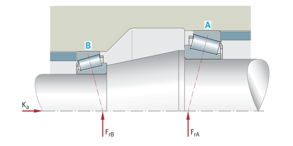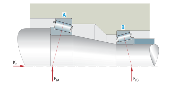 調(diào)整后的軸承布置,帶有兩個X形布置的單列圓錐滾子軸承,外力 Ka=作用在軸上的外部軸向力 FrA=徑向載荷,軸承A FrB=徑向載荷,軸承B | ![]() |