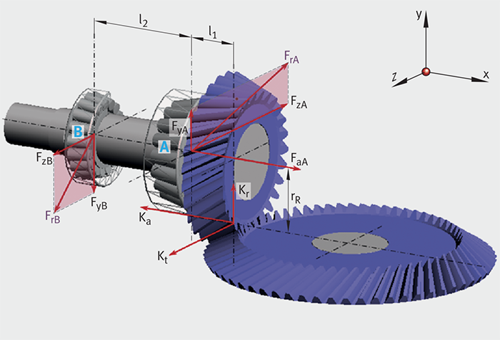 軸承A和B上的載荷 Ka=外部軸向力=6.52 kN Kr=徑向外力 Kt=切向力 FrA=徑向載荷,軸承A(反作用力FyA和FzA的合力?) FrB=徑向載荷,軸承B(反作用力FyB和FzB的合力?) l1=小齒輪和軸承A的接觸錐頂點之間的間距 l2=軸承A和軸承B的接觸錐頂點之間的間距 | ![]() |