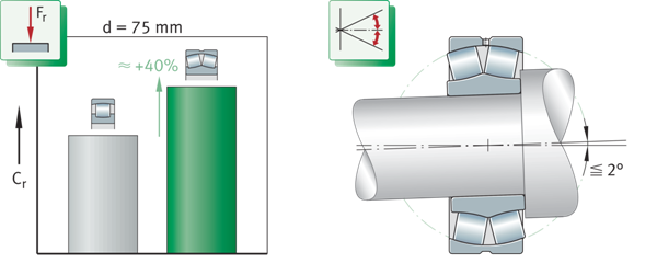 調心滾子軸承: 與同尺寸圓柱滾子軸承承載能力的比較及誤差補償 Fr=徑向載荷 Cr=基本動態額定載荷 | ![]() |