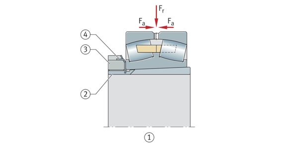 帶緊定套的調心滾子軸承 Fr=徑向載荷 Fa=軸向載荷 ①內圈帶剛性中心肋的調心滾子軸承,帶緊定套 ②緊定套 ③鎖緊螺母 ④止動墊圈 | ![]() |