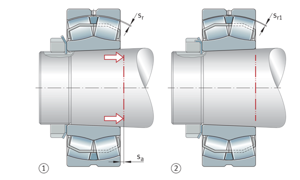 徑向內部間隙減小 sa=軸向壓緊距離(軸承的軸向向上驅動距離) sr=安裝前的徑向內部間隙 sr1=安裝后的徑向內部間隙 sr–sr1=徑向內部間隙減小 ①安裝前 ②安裝后 | ![]() |