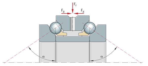 軸向角接觸球軸承2344,雙向 α=標(biāo)稱接觸角 Fr=徑向載荷 Fa=軸向載荷 | ![]() |