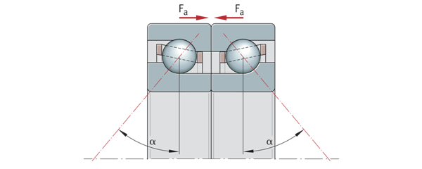 角接觸球軸承BAX,背靠背配對 α=標(biāo)稱接觸角 Fa=軸向載荷 | ![]() |