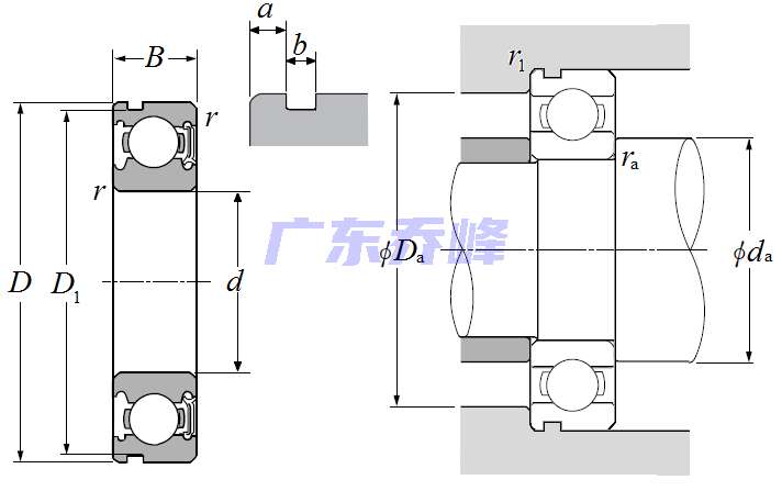 | 單列深溝球軸承 - 單面密封(輕接觸橡膠密封)帶止動環槽 - 尺寸 | |